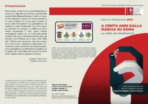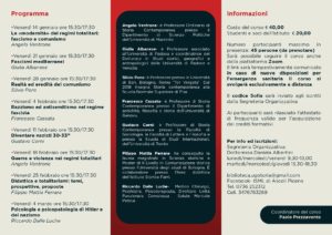Il Novecento è stato il secolo dei Totalitarismi. A cento anni dalla Marcia su Roma e quindi dalla nascita della dittatura fascista, il corso si propone di analizzare le ragioni che hanno permesso ai regimi totalitari di conquistare il potere, il senso della “rivoluzione” che promettevano di realizzare e della “modernità” che affermavano di incarnare, le analogie e le differenze che li hanno accomunati e nello stesso tempo contrapposti. Inoltre, con un occhio alle grandi questioni che oggi ci troviamo ad affrontare, gli incontri esamineranno sia il senso della sfida che i Totalitarismi lanciarono alle democrazie, sia in che modo e attraverso quali nuovi strumenti di governo ritenevano di poterne superare le contraddizioni ed eliminarne la fragilità, sia le ragioni del crollo delle democrazie nei Paesi dove i regimi totalitari giunsero al potere.